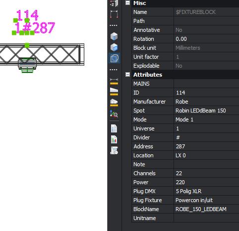 Het patch block is meestal "gekoppeld" aan een lamp in de tekening, maar dat hoeft niet. Met alleen patch blocks kan er prima een patch gemaakt worden. Het patch block heeft een flink aantal attributes, waarvan er standaard maar enkele zichtbaar zijn (ID, Universe en Address).