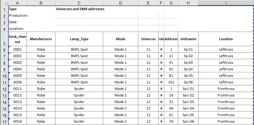 DMX Template: Bij uitvoer van de patchlijst wordt een bestand gebruikt waarin de gegevens komen. Standaard is dit DMX Template.xlsx en staat ook in de Database map.