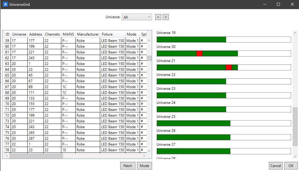 DMXPATCH Vult de adressen in aan de hand van de mode van de lamp in de volgorde van de ID. Als het nodig is om een nieuwe Universe aan te maken (adressen boven de 512) wordt daar melding van gemaakt.